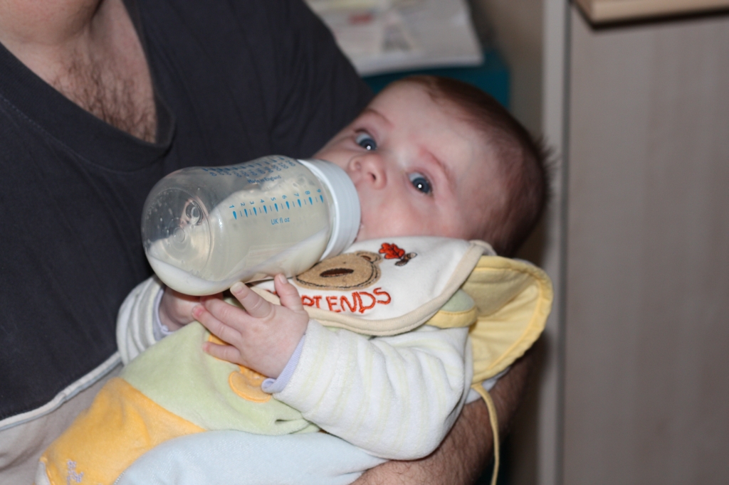 Enfin, je pose depuis peu mes mains sur mon biberon, mais je ne comprends pas encore trop ce que ça fait, je sais juste que ça me détend bien, surtout quand maman me donne le biberon dans ma chambre le soir, au calme :-)