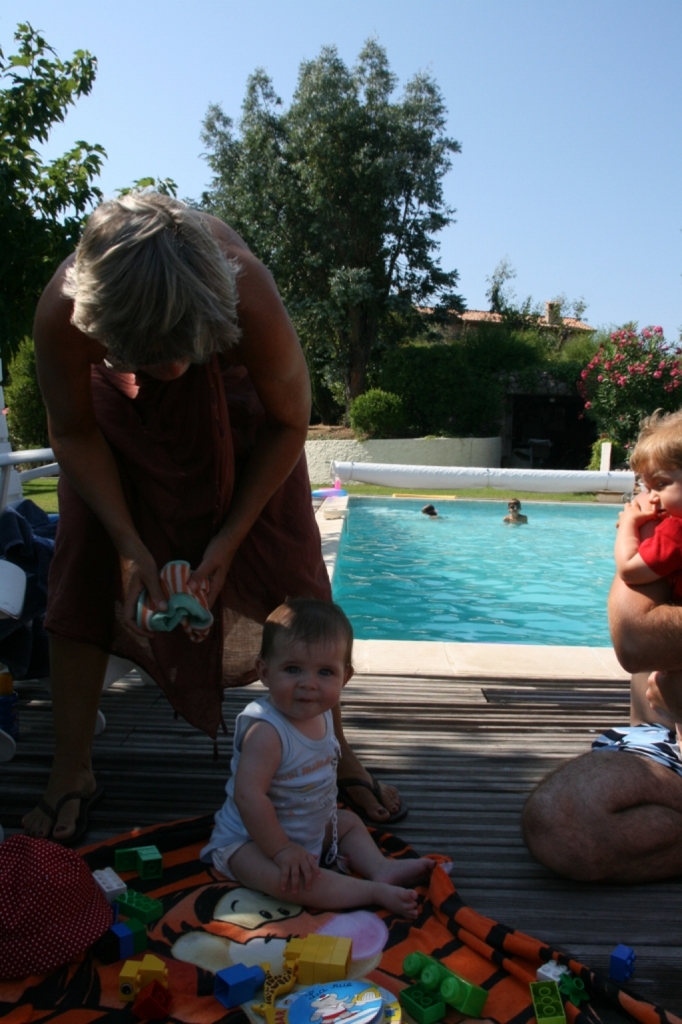 Au programme de ma semaine : la piscine, les siestes, les bons repas (même le yaourt avec grand-père!), les câlins, la mer, les bains avec cousine Diane, les courses de poussette avec cousin Tom, les histoires avec cousin Clément, l'anniversaire de cousin Pierre et plein de progrès avec grand-père et grand-mère et mes tontons et tatas ! Quelques désagréments à cause de mes dents du haut, qui ne veulent pas sortir, mais heureusement, tout le monde veille sur moi et me fait vite oublier tout ça. J'ai hâte de revoir papa et maman pour leur raconter tout ça !