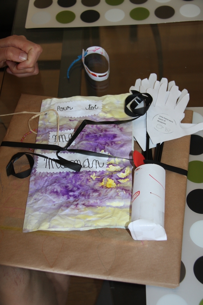 Cadeaux de fête des mères : j'ai été très gâtée cette année ! Une carte avec une belle récitation, un bracelet en papier, une magnifique peinture de maman et son bébé dans son ventre, et personnellement mon préféré : un bouquet de mains de l'école d'espagnol. "Comme ça tu ne pourras plus dire que tu n'as pas 36 mains", m'a bien précisé Lou... :-)